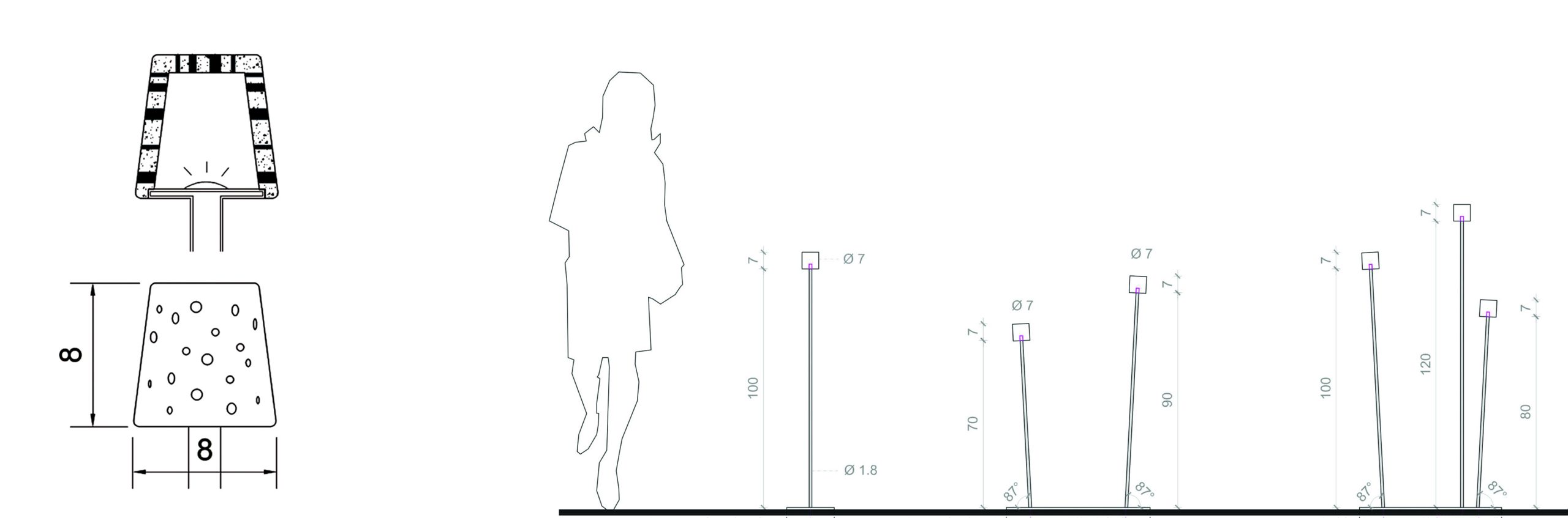 Thus the arrangement of these elements in conjunction with the kinetic potential of alternately emerging and vanishing light signals allows for the composition of various interactive light ensembles, which can be creatively synchronized with the soundscape of the respective site.